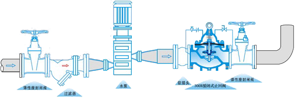300X缓闭止回阀由主阀、单向阀、针阀、球阀、微形过滤器和压力表组成水力控制接管系统。利用水力自动操作,可使主阀得到最佳的开启或关闭速度。防止水锺水击的产生,以达到缓闭消声的效果。